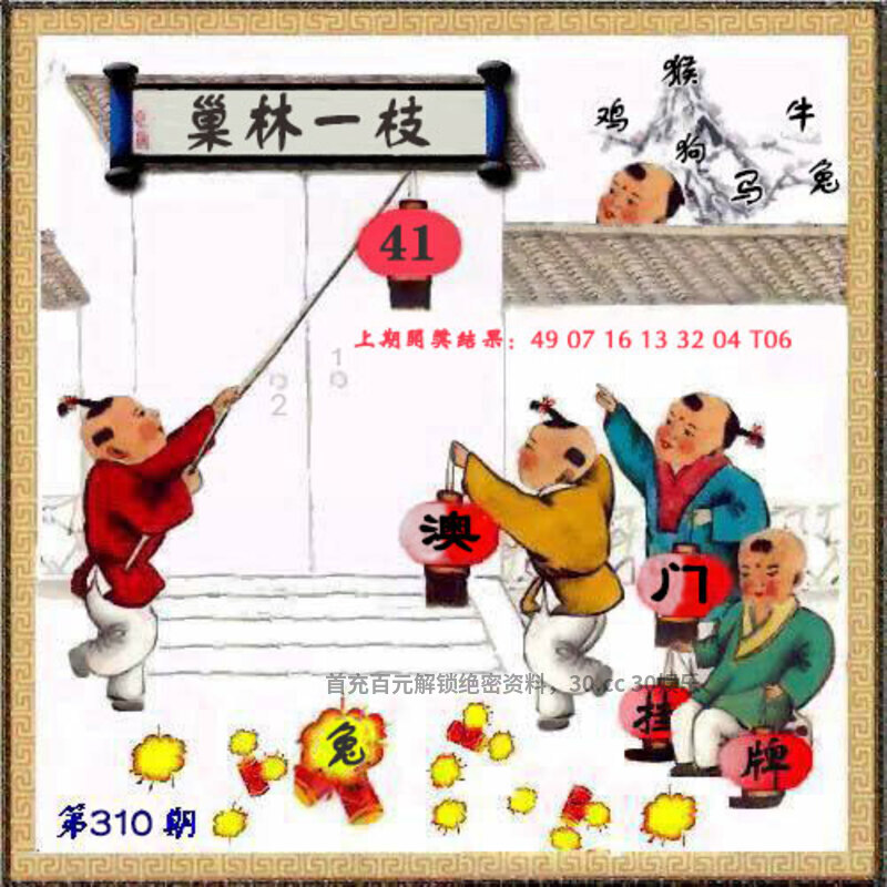 | 310期挂牌《巢林一枝》 解释:原指鹪鹩筑巢仅需占用一根树枝,后引申为比喻人安守本分、不贪求多余之物。 解:比喻人安守本分、不贪求多余之物解猪狗猴牛虎羊,挂:41 爆:兔。 综合:兔牛猪狗猴虎羊 |